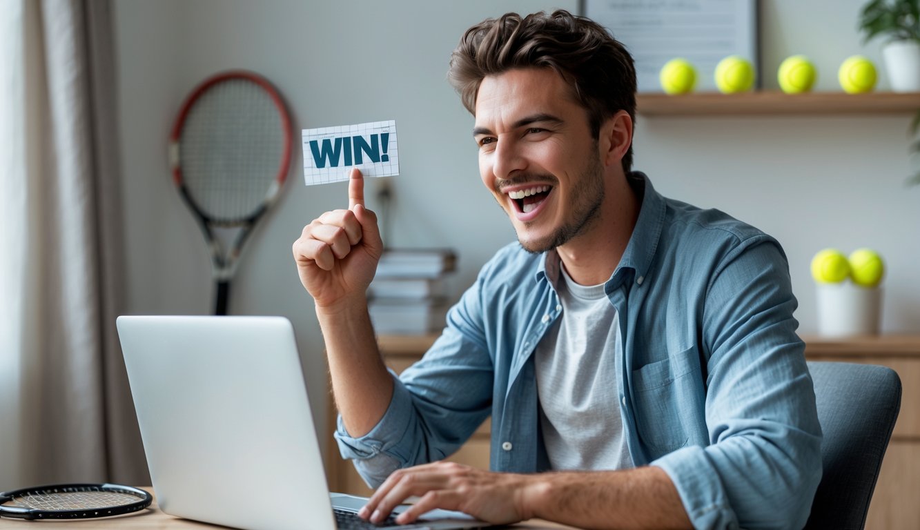 Seorang pria muda sedang merayakan kemenangan kecil sambil menggunakan laptop di ruang kerja modern dengan perlengkapan tenis di latar belakang.