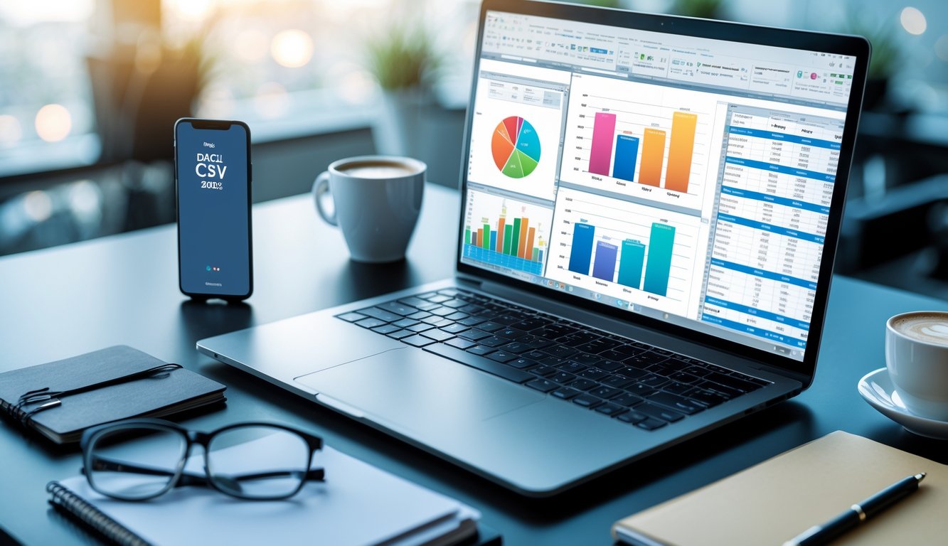 Meja kerja modern dengan laptop yang menampilkan spreadsheet data, grafik cetak, dan ponsel yang menunjukkan aplikasi data.