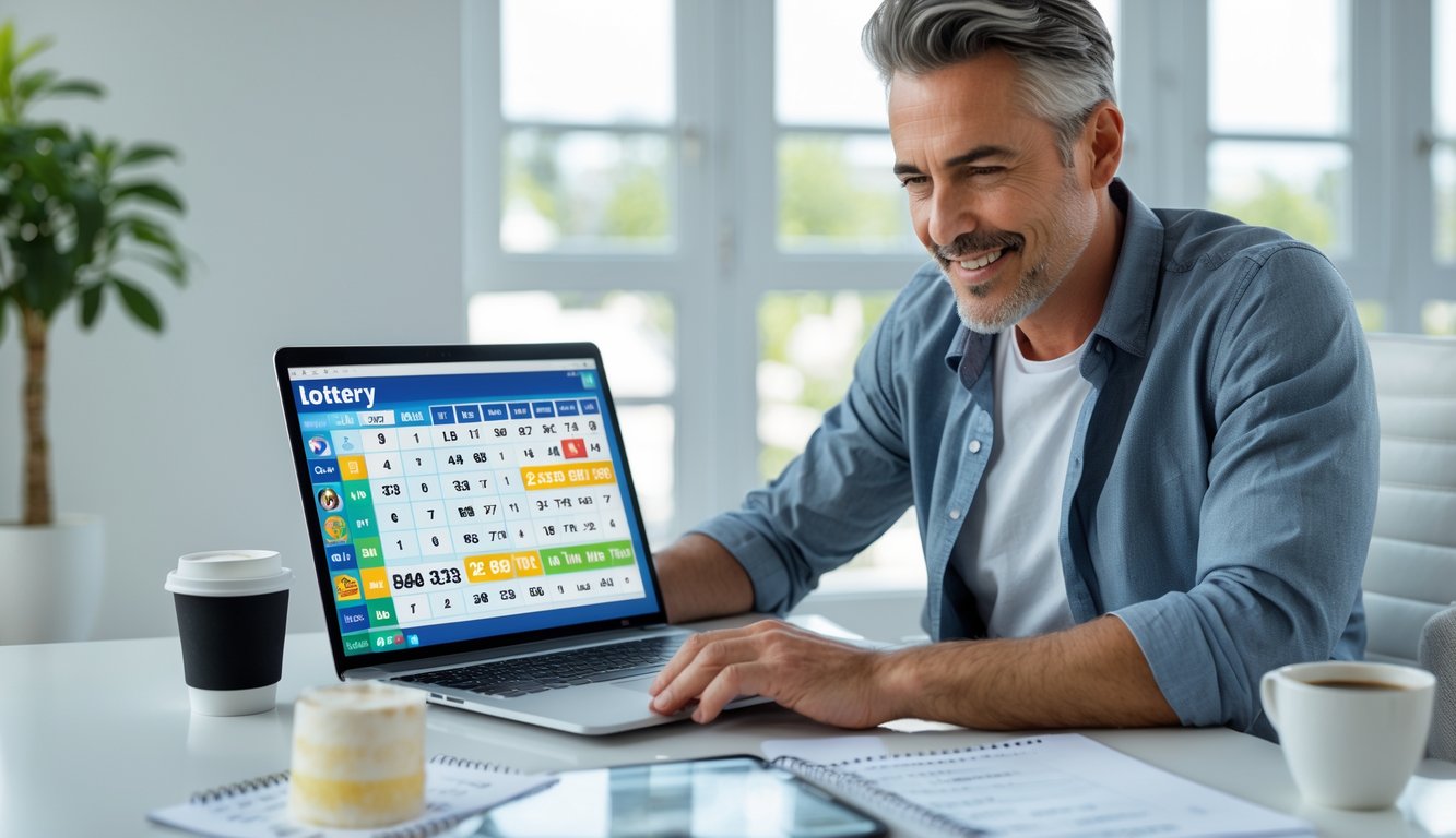 Seorang pria duduk di meja dengan laptop dan ponsel, fokus melihat layar yang menampilkan angka lotere dan catatan, di ruang kerja yang terang dan rapi.