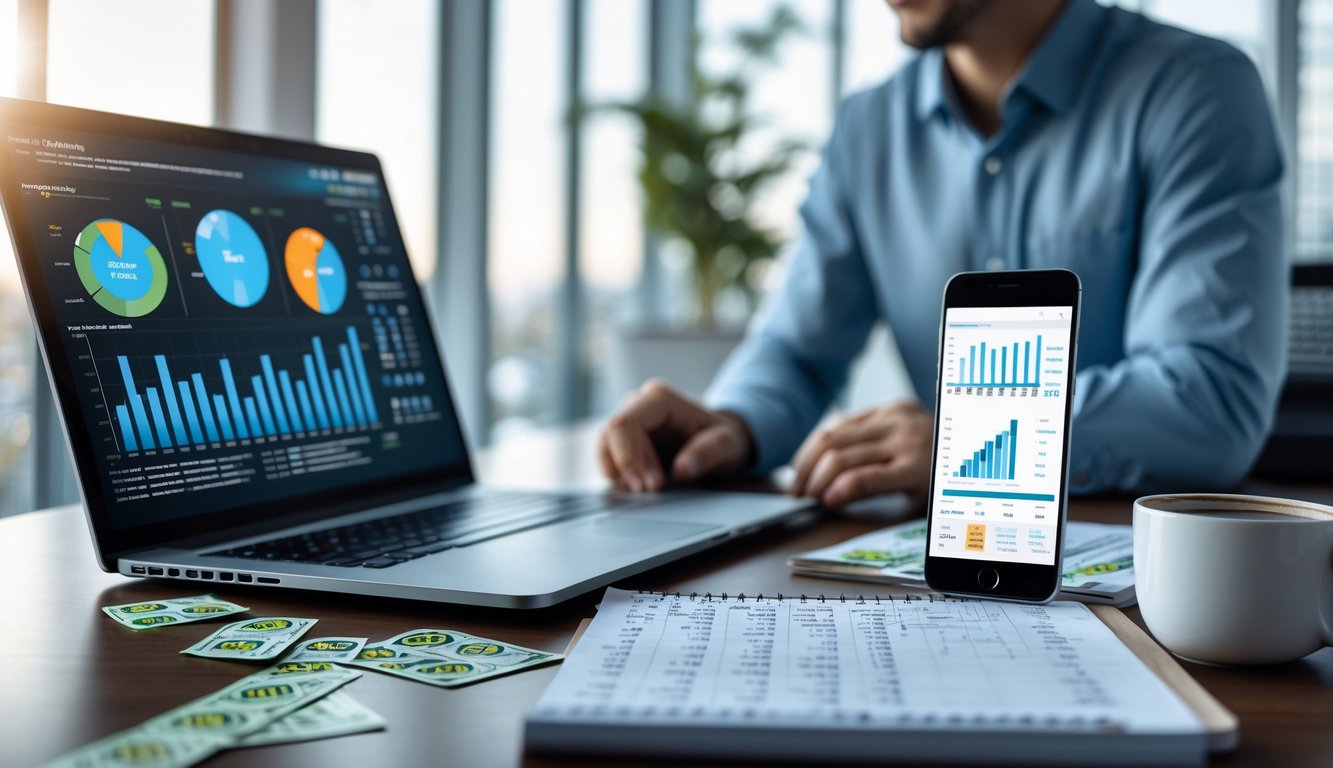 Meja kerja modern dengan laptop, smartphone, catatan, tiket lotre, dan secangkir kopi di ruang kantor yang terang.