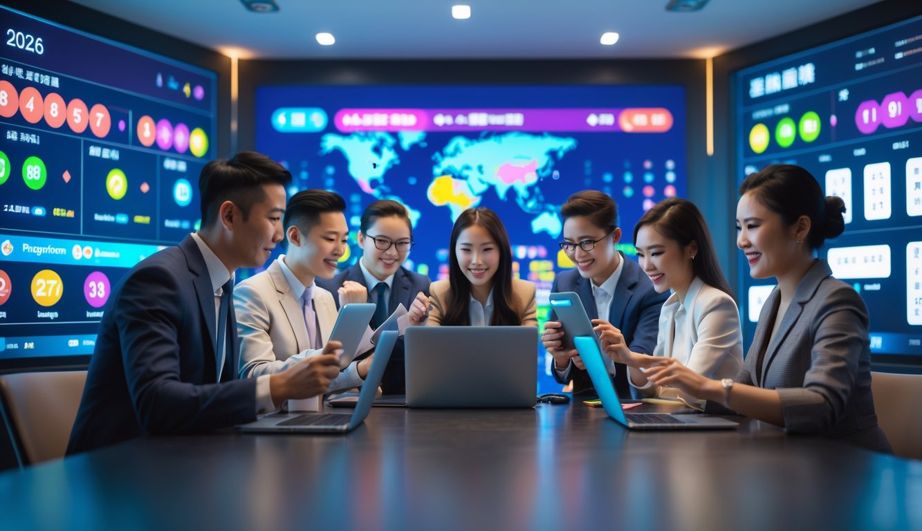 Beberapa orang sedang menggunakan perangkat digital di ruangan modern dengan layar besar menampilkan angka lotre dan grafik.